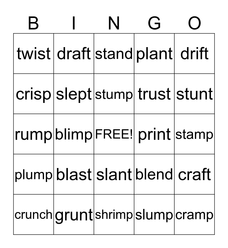 This bingo card has a free space and 24 words: blast, grunt, stump, crunch, drift, twist, crisp, draft, print, slant, trust, rump, blend, craft, slept, slump, stamp, stand, stunt, blimp, cramp, plump, plant and shrimp.