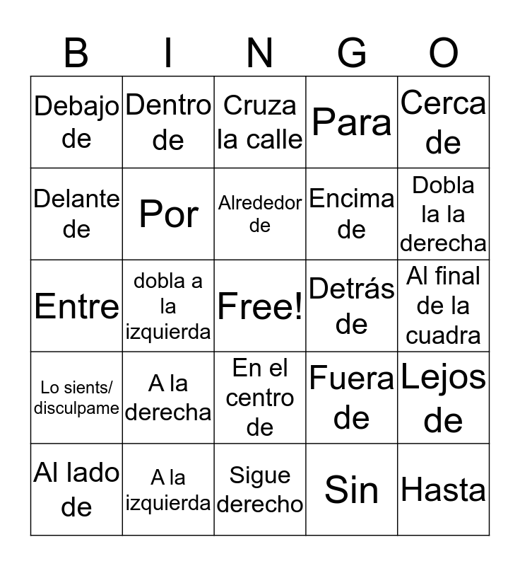 This bingo card has a free space and 24 words: A la derecha, A la izquierda, Alrededor de, Al lado de, Cerca de, Debajo de, Delante de, Dentro de, Detrás de, En el centro de, Encima de, Entre, Fuera de, Lejos de, Por, Sin, Al final de la cuadra, Cruza la calle, Dobla la la derecha, dobla a la izquierda, Hasta, Lo sients/ disculpame, Para and Sigue derecho.