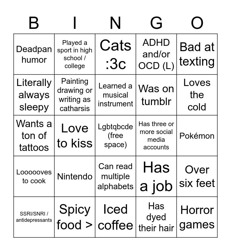 This bingo card has a free space and 24 words: Nintendo, Spicy food >, Learned a musical instrument, SSRI/SNRI / antidepressants, Bad at texting, Deadpan humor, Literally always sleepy, Played a sport in high school / college, Has three or more social media accounts, Can read multiple alphabets, Was on tumblr, Wants a ton of tattoos, Has a job, Over six feet, Painting drawing or writing as catharsis, Has dyed their hair, Pokémon, Cats :3c, Loves the cold, Love to kiss, Horror games, Loooooves to cook, ADHD and/or OCD (L) and Iced coffee.