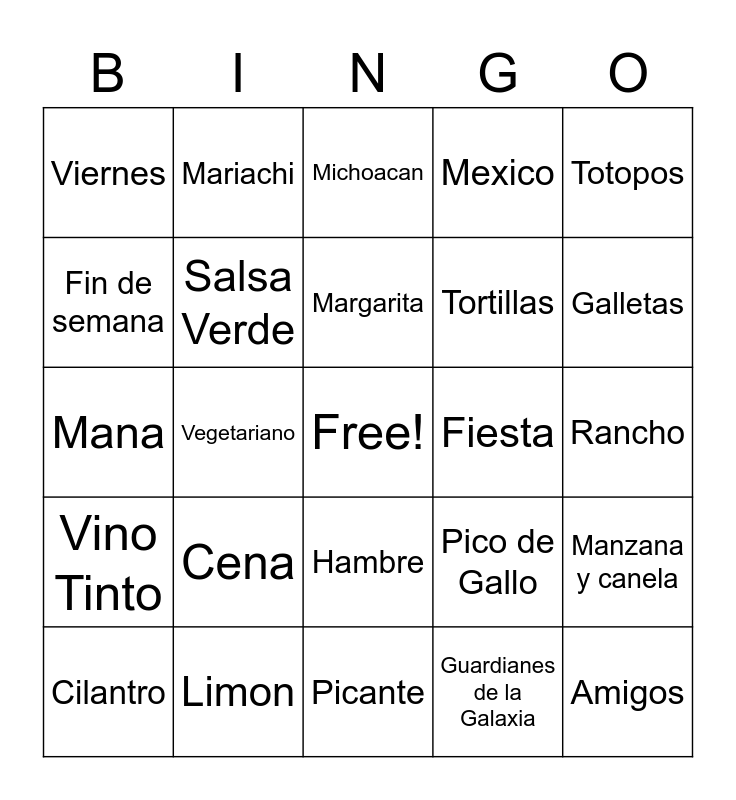 This bingo card has a free space and 36 words: Batalla de Puebla, Tequila, Mezcal, Salsa Verde, Pico de Gallo, Vino Tinto, Margarita, Enchiladas, Totopos, Crema, Vegetariano, Mexico, Cinco de Mayo, Fiesta, Galletas, Viernes, Nueva Zelanda, Cena, Amigos, Michoacan, Rancho, Manzana y canela, Limon, Cilantro, Picante, Mariachi, Mana, Maiz, Tortillas, Fin de semana, Pura vida, Lluvia, Guardianes de la Galaxia, Hambre, Guacamole and Comal.