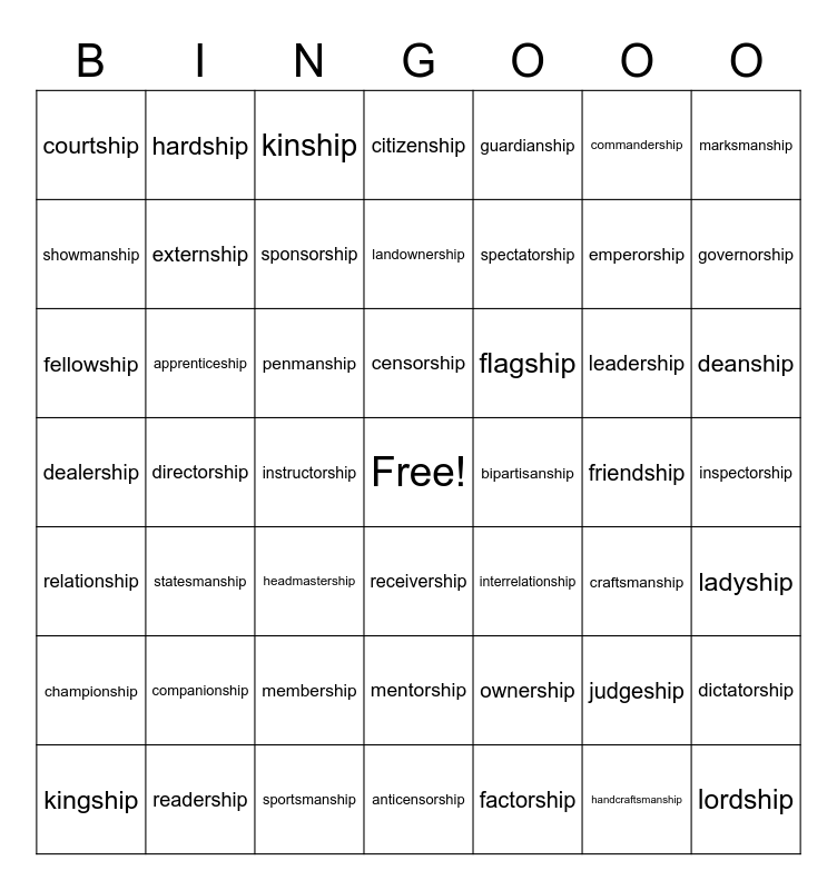 This bingo card has a free space and 54 words: anticensorship, apprenticeship, battleship, bipartisanship, censorship, championship, citizenship, clerkship, commandership, companionship, courtship, craftsmanship, dealership, deanship, dictatorship, directorship, emperorship, externship, factorship, fellowship, flagship, friendship, governorship, guardianship, handcraftsmanship, hardship, headmastership, horsemanship, inspectorship, instructorship, internship, interrelationship, judgeship, kingship, kinship, ladyship, landownership, leadership, lordship, marksmanship, membership, mentorship, ownership, partnership, penmanship, readership, receivership, relationship, showmanship, spectatorship, sponsorship, sportsmanship, statesmanship and workmanship.
