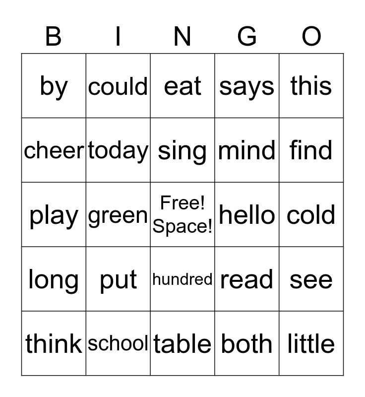 This bingo card has a free space and 24 words: put, school, sing, think, this, by, cheer, could, hello, hundred, mind, play, read, see, today, both, cold, eat, find, green, little, long, says and table.