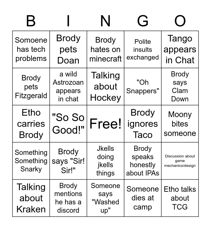 This bingo card has a free space and 25 words: Brody says "Sir! Sir!", Someone says "Washed up", Talking about Hockey, Talking about Kraken, Tango appears in Chat, Somoene has tech problems, Brody pets Fitzgerald, Brody pets Doan, Brody ignores Taco, Jkells doing jkells things, "Oh Snappers", Etho carries Brody, Brody speaks honestly about IPAs, Discussion about game mechanics/design, a wild Astrozoan appears in chat, EvilNotion appears in chat, Moony bites someone, Brody hates on minecraft, Brody says Clam Down, "So So Good!", Etho talks about TCG, Brody mentions he has a discord, Something Something Snarky, Polite insults exchanged and Someone dies at camp.