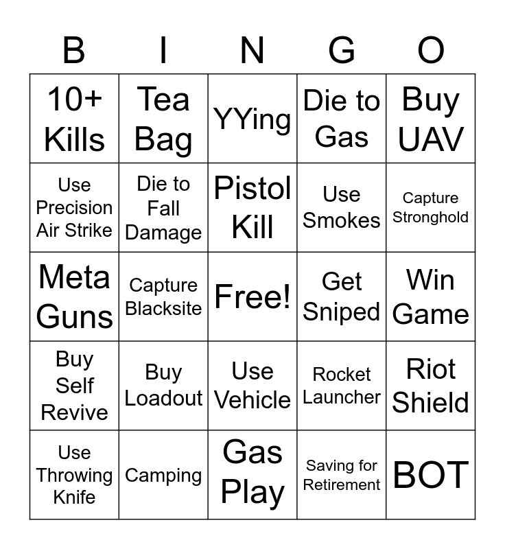 This bingo card has a free space and 24 words: Buy Loadout, Camping, Pistol Kill, Use Throwing Knife, Buy UAV, 10+ Kills, Use Precision Air Strike, Tea Bag, Get Sniped, Use Vehicle, Use Smokes, Meta Guns, Rocket Launcher, Riot Shield, Die to Fall Damage, Saving for Retirement, Win Game, YYing, Capture Stronghold, Capture Blacksite, BOT, Buy Self Revive, Die to Gas and Gas Play.