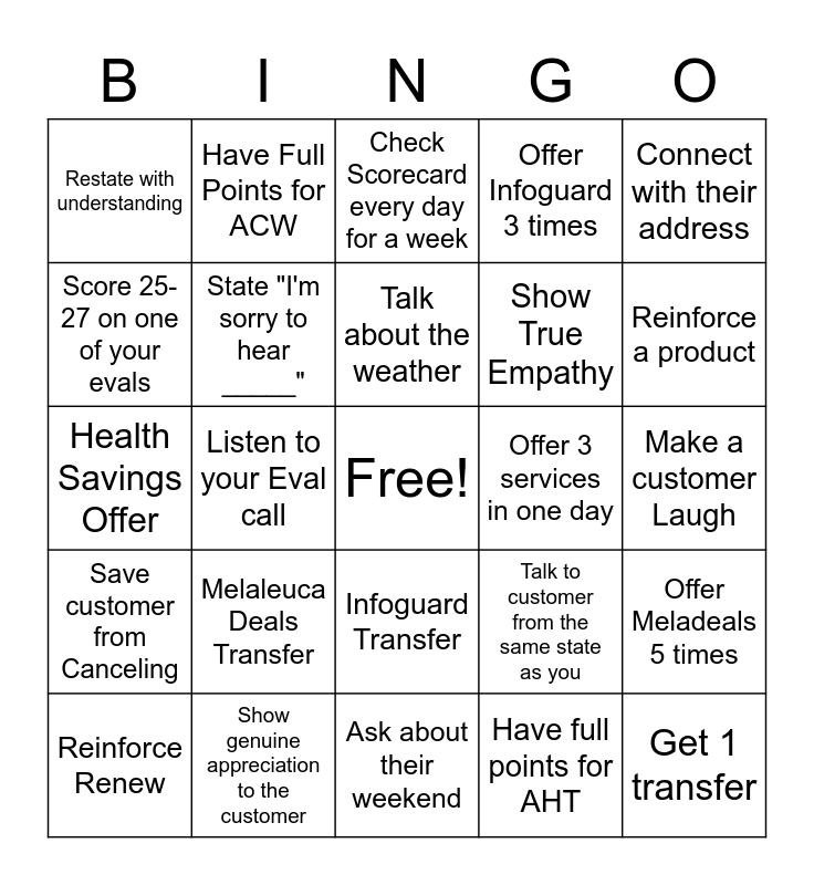 This bingo card has a free space and 24 words: Melaleuca Deals Transfer, Show genuine appreciation to the customer, Talk about the weather, Reinforce Renew, Connect with their address, Restate with understanding, Score 25-27 on one of your evals, Have Full Points for ACW, Offer 3 services in one day, Infoguard Transfer, Show True Empathy, Health Savings Offer, Talk to customer from the same state as you, Offer Meladeals 5 times, State "I'm sorry to hear _____", Have full points for AHT, Make a customer Laugh, Check Scorecard every day for a week, Reinforce a product, Listen to your Eval call, Get 1 transfer, Save customer from Canceling, Offer Infoguard 3 times and Ask about their weekend.
