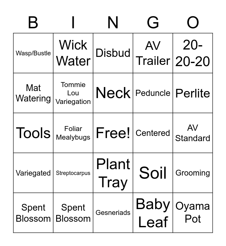 This bingo card has a free space and 58 words: Sucker, Spent Blossom, Symmetry, Variegated, Baby Leaf, Seed Pod, Tommie Lou Variegation, Under Potted, Peduncle, Petiole, AV Trailer, Chimera, Natural Light, Fantasy, LED Lights, Wasp/Bustle, Oyama Pot, 20-20-20, Over Potted, Neck, Centered, Disbud, Spent Blossom, Grooming, First Class, AV Standard, Soil Mealy Bugs, AV Miniatures, Perlite, Vermiculite, AV Semi-miniature, Thrips, Sport, Springtails, AVSA Show, Crown, Plant Cart/Stand, Foliar Mealybugs, Tools, Spider Mites, Streptocarpus, Kohlerias, Soil, Cyclamen Mite, Episcia, Primulina, Leaf Support, Plant Tray, Gesneriads, Foliar Feed, Propagate, Saucer, Streptocarpella, Girl Leaf, Wick Water, Species, Mat Watering and Powder Mildew.