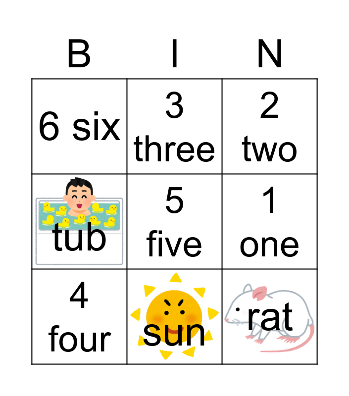 This bingo card has 3 images, a free space and 8 words: 1 one, 2 two, 3 three, 4 four, 6 six, rat, tub and sun.