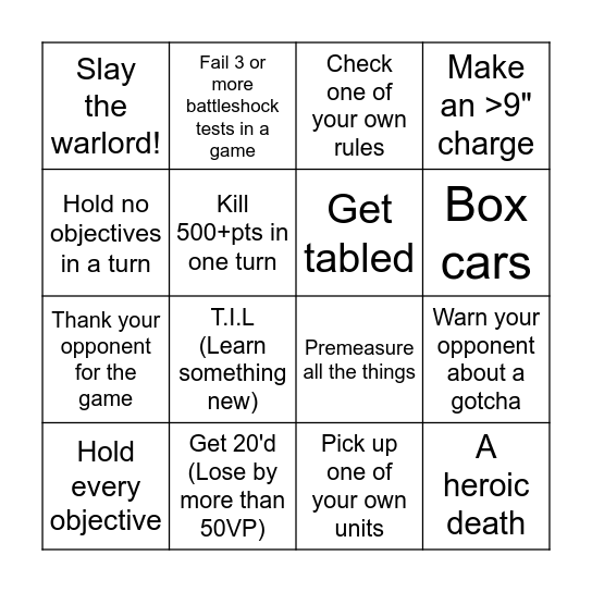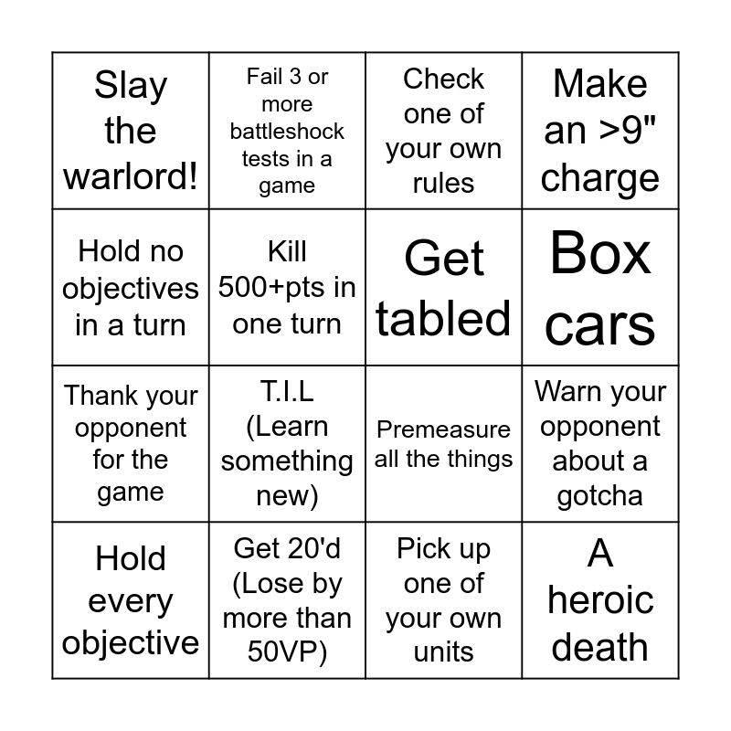 This bingo card has 55 words: Buy your opponent a drink, Roll five or more 1's in a single roll, CP reroll a 1 into a 1, Slay the warlord!, Compliment your opponent, Lose your most expensive unit in one phase, Get tabled, Roll five or more 6's in a single roll, Thank your opponent for the game, Kill your opponent's most expensive unit in one phase, Make an >9" charge, Snake eyes, Table your opponent, Give your opponent a take-back, Read the player pack!, WAAAGH!!!! (Full send), Hold no objectives in a turn, Warn your opponent about a gotcha, The Emperor protects!!!! (Survive against the odds), Hold every objective, Get 20'd (Lose by more than 50VP), Get a 20 (Win by more than 50VP), Fail a <5" charge, Check one of your own rules, Declare your intent, Box cars, Lose/gain an objective due to a single dice roll, Lose a unit to overwatch, Pick up one of your own units, Sole survivor (Finish a game with one model left), Actually finish a game, Score 20+VP in a turn, Score 0VP in a turn, Lose 500+pts in one turn, Kill 500+pts in one turn, Premeasure all the things, Lose a unit to deadly demise, A heroic death, First blood, Linebreaker (Have a unit in the enemy DZ at the end of the game), Fail 3 or more battleshock tests in a game, Hold the line (No enemy units in your DZ at the end of the game), Lose a unit in reserves, New model syndrome, Total whiff, No place like home (Hold your home objective all game), Invasion (Take your opponent's home objective), Dead draw (Score no secondaries in a turn), Averages aren't real (Roll significantly above/below average), T.I.L (Learn something new), Mere mortal (Lose a unit to mortal wounds), KABOOM!, Use tokens, Killing Spree (Kill multiple units with one of your units in a turn) and Noodle fight.