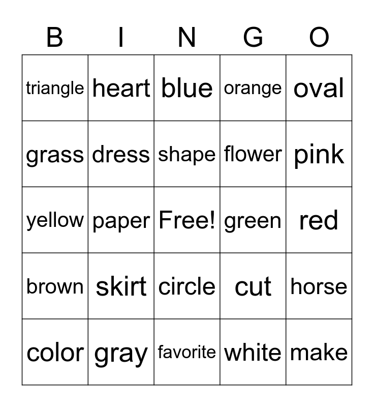 This bingo card has a free space and 28 words: horse, black, flower, white, grass, blue, heart, brown, green, color, yellow, orange, gray, favorite, pink, purple, skirt, dress, shape, circle, triangle, square, make, paper, red, cut, oval and star.