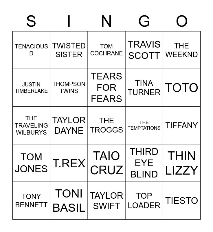 This bingo card has 25 words: T.REX, TAYLOR SWIFT, TEARS FOR FEARS, TONY BENNETT, THE WEEKND, TENACIOUS D, JUSTIN TIMBERLAKE, TWISTED SISTER, THE TEMPTATIONS, TAIO CRUZ, TINA TURNER, THE TRAVELING WILBURYS, THIRD EYE BLIND, THIN LIZZY, THOMPSON TWINS, TIESTO, TIFFANY, TOM COCHRANE, TOTO, TAYLOR DAYNE, THE TROGGS, TONI BASIL, TOM JONES, TRAVIS SCOTT and TOP LOADER.