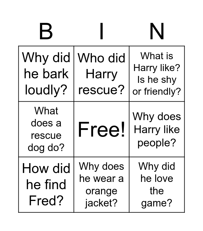 This bingo card has a free space and 8 words: Why does Harry like people?, What is Harry like? Is he shy or friendly?, Who did Harry rescue?, How did he find Fred?, Why did he bark loudly?, Why did he love the game?, What does a rescue dog do? and Why does he wear a orange jacket?.
