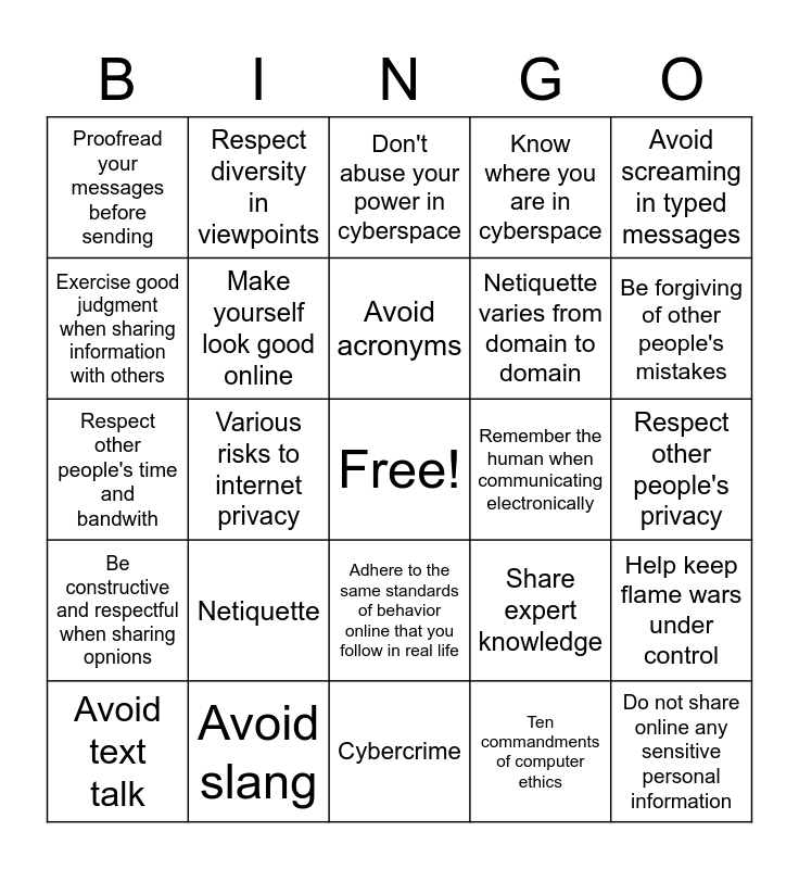 This bingo card has a free space and 24 words: Netiquette, Avoid slang, Avoid acronyms, Avoid text talk, Avoid screaming in typed messages, Proofread your messages before sending, Exercise good judgment when sharing information with others, Respect diversity in viewpoints, Remember the human when communicating electronically, Adhere to the same standards of behavior online that you follow in real life, Netiquette varies from domain to domain, Respect other people's time and bandwith, Share expert knowledge, Help keep flame wars under control, Make yourself look good online, Ten commandments of computer ethics, Respect other people's privacy, Don't abuse your power in cyberspace, Be forgiving of other people's mistakes, Various risks to internet privacy, Do not share online any sensitive personal information, Be constructive and respectful when sharing opnions, Know where you are in cyberspace and Cybercrime.
