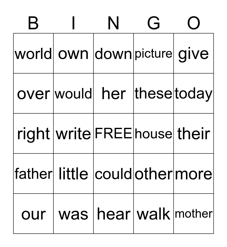 This bingo card has a free space and 24 words: little, was, her, our, give, world, over, own, house, could, these, right, other, more, would, walk, their, down, today, write, mother, father, picture and hear.