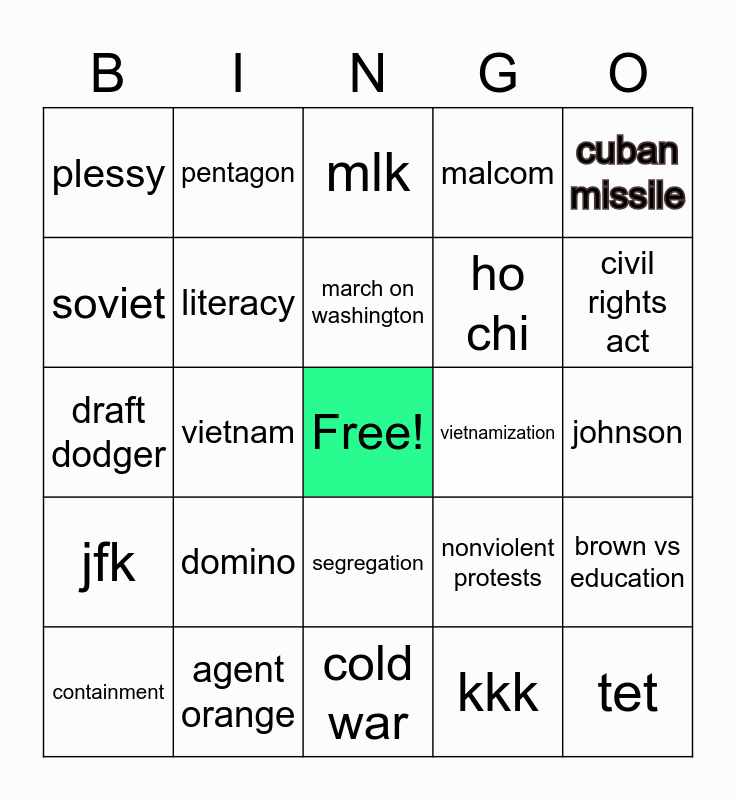 This bingo card has a free space and 24 words: domino, agent orange, march on washington, containment, cuban missile, plessy, soviet, pentagon, vietnamization, segregation, ho chi, draft dodger, nonviolent protests, brown vs education, literacy, kkk, johnson, mlk, civil rights act, vietnam, tet, jfk, malcom and cold war.