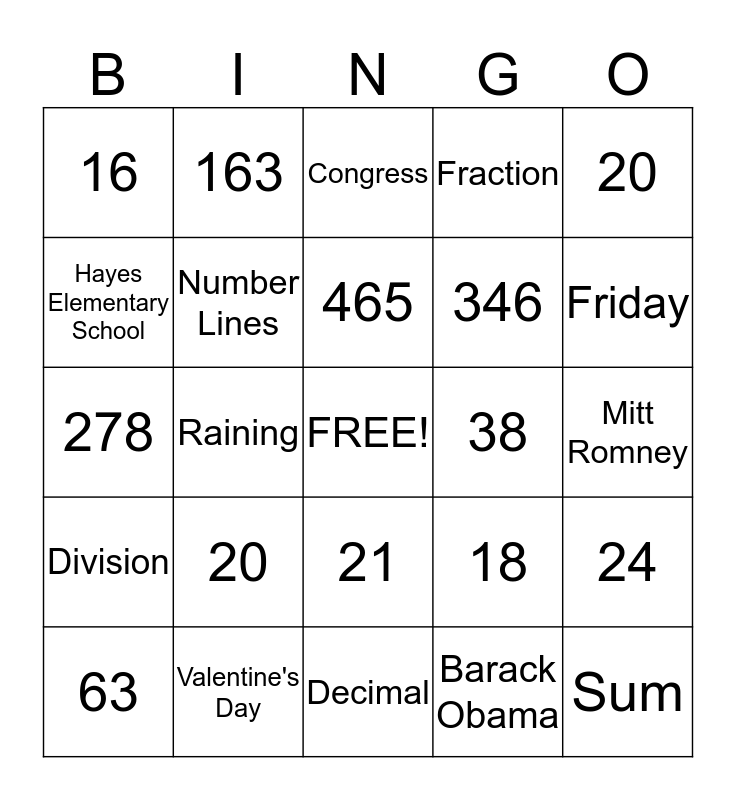 This bingo card has a free space and 24 words: 20, Valentine's Day, 465, 63, 20, 16, Hayes Elementary School, 163, 38, 21, 346, 278, 18, 24, Number Lines, Barack Obama, Mitt Romney, Congress, Friday, Raining, Sum, Division, Fraction and Decimal.