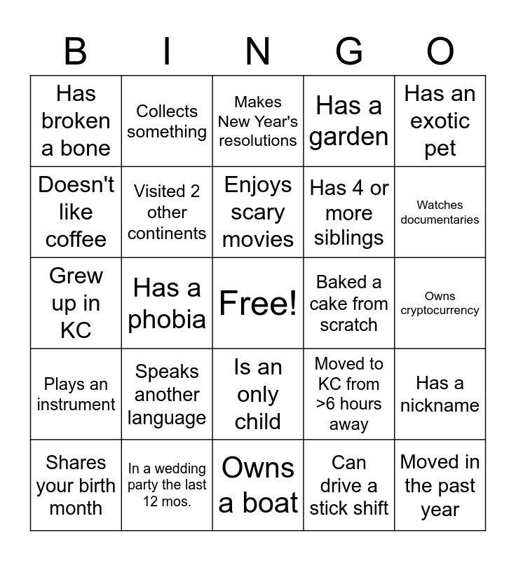 This bingo card has a free space and 29 words: Shares your birth month, Performed in public, Has a phobia, Is allergic to something, Has broken a bone, Makes New Year's resolutions, Visited 2 other continents, Speaks another language, Baked a cake from scratch, In a wedding party the last 12 mos., Owns cryptocurrency, Moved in the past year, Owns a boat, Can drive a stick shift, Watches documentaries, Likes true crime podcasts, Is an only child, Plays an instrument, Has an exotic pet, Grew up in KC, Moved to KC from >6 hours away, Paints/ Draws/ Sculpts, Has 4 or more siblings, Doesn't like coffee, Has a garden, Collects something, Has a nickname, Enjoys scary movies and Likes Chinese food.