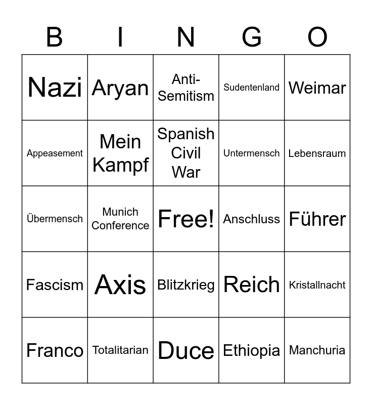 This bingo card has a free space and 24 words: Axis, Totalitarian, Spanish Civil War, Franco, Weimar, Nazi, Appeasement, Aryan, Anschluss, Blitzkrieg, Untermensch, Übermensch, Reich, Kristallnacht, Mein Kampf, Ethiopia, Führer, Anti-Semitism, Lebensraum, Munich Conference, Manchuria, Fascism, Sudentenland and Duce.