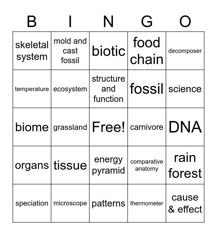 This bingo card has a free space and 24 words: tissue, microscope, structure and function, speciation, decomposer, skeletal system, temperature, mold and cast fossil, carnivore, energy pyramid, fossil, biome, comparative anatomy, rain forest, ecosystem, thermometer, DNA, biotic, science, grassland, cause & effect, organs, food chain and patterns.