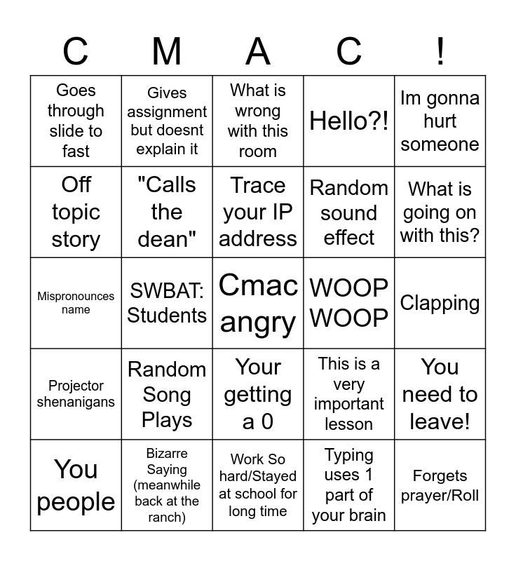 This bingo card has a free space and 29 words: You people, One of us are gonna talk, SWBAT: Students, Bad Handwriting, Goes through slide to fast, What is wrong with this room, "Calls the dean", Random Song Plays, WOOP WOOP, Bizarre Saying (meanwhile back at the ranch), Clapping, Forgets prayer/Roll, Work So hard/Stayed at school for long time, Typing uses 1 part of your brain, What is going on with this?, This test is worth 50% or your grade, Your getting a 0, Projector shenanigans, Im gonna hurt someone, Mispronounces name, This is a very important lesson, Goofy, Random sound effect, Off topic story, Hello?!, Gives assignment but doesnt explain it, You need to leave!, Trace your IP address and Jacob/Singing.