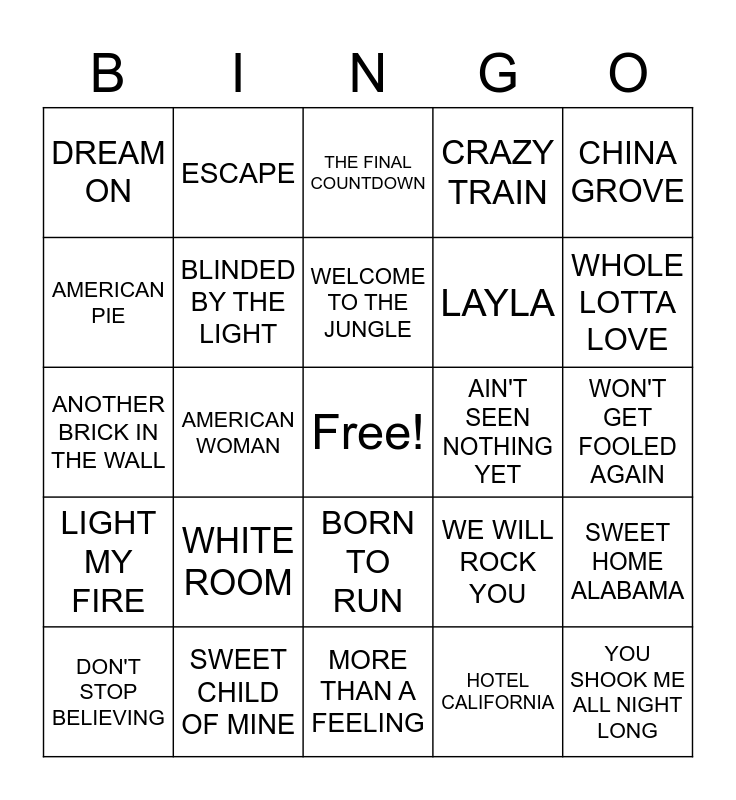 This bingo card has a free space and 24 words: WHITE ROOM, SWEET CHILD OF MINE, WELCOME TO THE JUNGLE, DON'T STOP BELIEVING, CHINA GROVE, DREAM ON, AMERICAN PIE, ESCAPE, AIN'T SEEN NOTHING YET, BORN TO RUN, LAYLA, ANOTHER BRICK IN THE WALL, WE WILL ROCK YOU, SWEET HOME ALABAMA, BLINDED BY THE LIGHT, HOTEL CALIFORNIA, WON'T GET FOOLED AGAIN, THE FINAL COUNTDOWN, WHOLE LOTTA LOVE, AMERICAN WOMAN, YOU SHOOK ME ALL NIGHT LONG, LIGHT MY FIRE, CRAZY TRAIN and MORE THAN A FEELING.