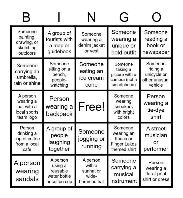 This bingo card has a free space and 66 words: Person wearing a Cornell University shirt, Couple taking a selfie, Someone walking a dog, A street musician or performer, Person wearing a hat, Someone riding a bicycle, A group of tourists with a map or guidebook, Person wearing sunglasses, Someone eating an ice cream cone, A person carrying a shopping bag from a local store, Someone jogging or running, A child playing in a park or playground, Person wearing a tie-dye shirt, Someone reading a book or newspaper, A person wearing headphones, Someone carrying an umbrella, rain or shine, Person wearing a backpack, Someone painting, drawing, or sketching outdoors, A person wearing a scarf, Someone taking a picture with a camera (not a smartphone), A group of people laughing together, Person drinking a cup of coffee from a local cafe, Someone wearing a unique or bold outfit, A person sitting alone and enjoying the scenery, Someone wearing a sports jersey, A person with colorful hair, Someone using a skateboard or rollerblades, A couple holding hands, Person wearing a floral-print shirt or dress, Someone talking on their phone, A person wearing sandals, Someone wearing a wristwatch, Someone wearing a vintage or retro outfit, A person with a visible tattoo, Someone wearing an Ithaca or Finger Lakes themed shirt, A person using a reusable water bottle or coffee cup, Someone wearing all black, A person wearing a hat with a local sports team logo, Someone carrying a musical instrument, A person with a baby stroller, Someone sitting on a bench, people-watching, A person with a messenger bag or crossbody bag, Someone wearing sneakers with bright colors, A person with an interesting beard or mustache, Someone using a laptop in a park or outdoor cafe, A person wearing a band t-shirt, Someone riding a unicycle or other unusual vehicle, A person wearing a raincoat or poncho, Someone wearing a costume or cosplay, A person with an umbrella, even if it's not raining, Someone with a visible piercing, A person carrying a reusable shopping bag, Someone wearing a unique or quirky piece of jewelry, A person wearing a local brewery or winery shirt, Someone with a dog wearing a bandana or outfit, A person using binoculars (for birdwatching or sightseeing), Someone wearing socks with sandals, A person carrying a yoga mat, Someone wearing a denim jacket or vest, A person with a sunhat or wide-brimmed hat, Someone laughing out loud (in a good way), A person with a skateboard or longboard, Someone wearing a pair of unique or stylish glasses, A person taking a picture with their phone in landscape mode, SPECIAL: Spot someone doing 3 things from the card at once and SPECIAL: Spot a pair of people, each doing something different from the card.
