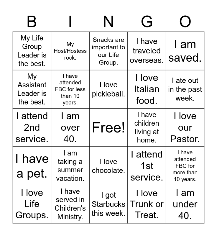 This bingo card has a free space and 24 words: I am taking a summer vacation., I have served in Children's Ministry., I love pickleball., I love Life Groups., I am saved., My Life Group Leader is the best., My Assistant Leader is the best., My Host/Hostess rock., I have children living at home., I love chocolate., I love Italian food., I attend 2nd service., I attend 1st service., I have attended FBC for more than 10 years., I have attended FBC for less than 10 years,, I love Trunk or Treat., I love our Pastor., Snacks are important to our Life Group., I ate out in the past week., I am over 40., I am under 40., I have a pet., I have traveled overseas. and I got Starbucks this week..