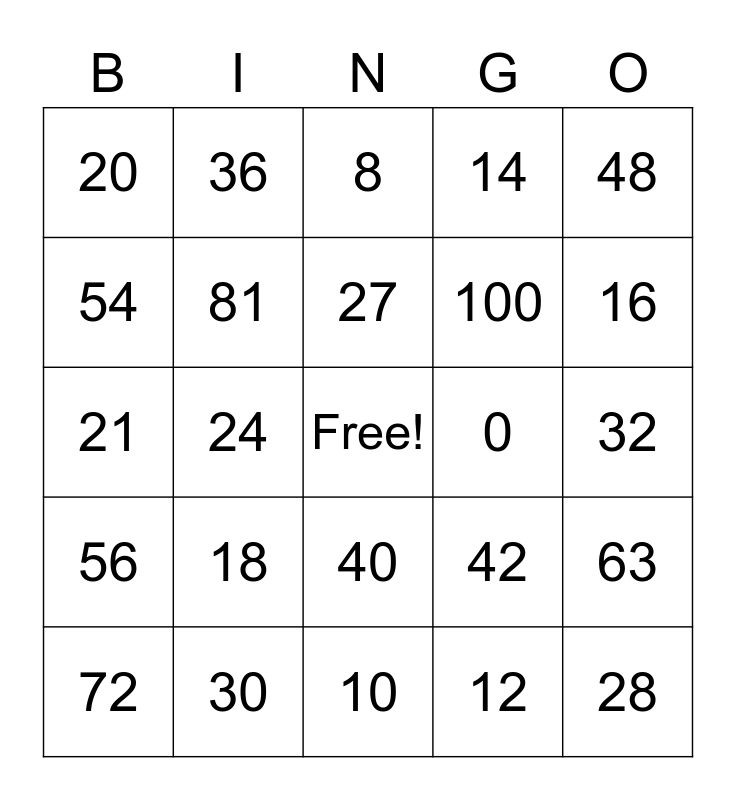 This bingo card has a free space and 24 words: 72, 18, 27, 12, 48, 20, 36, 8, 0, 32, 21, 81, 42, 63, 54, 30, 10, 14, 16, 56, 24, 40, 100 and 28.