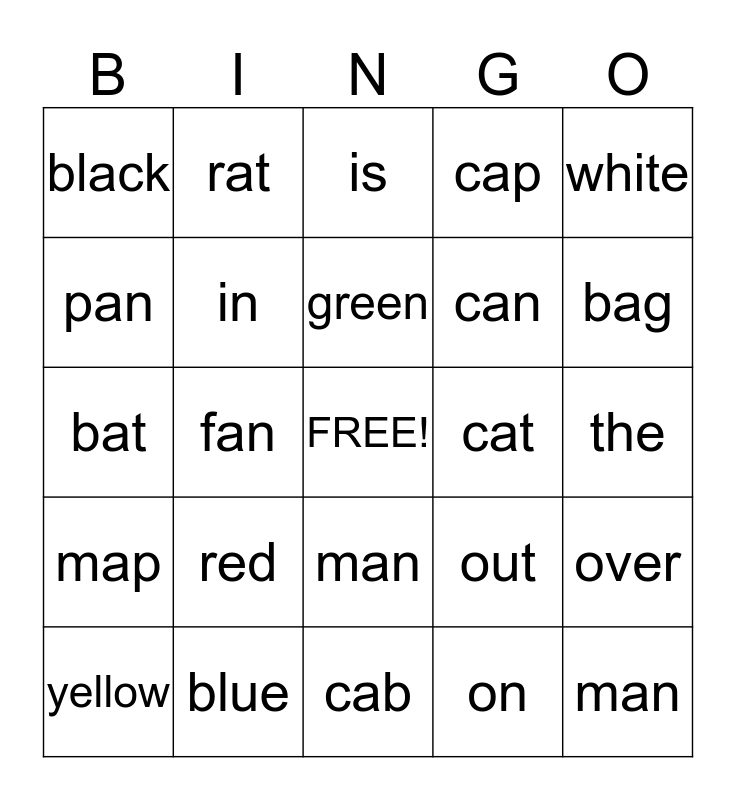 This bingo card has a free space and 24 words: red, blue, green, yellow, white, black, pan, rat, cat, man, can, bat, out, over, in, on, the, is, bag, fan, man, map, cap and cab.