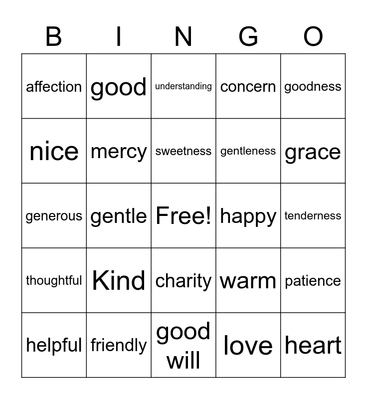 This bingo card has a free space and 24 words: Kind, friendly, sweetness, helpful, goodness, affection, nice, good, happy, charity, gentleness, generous, warm, patience, mercy, love, tenderness, understanding, grace, gentle, heart, thoughtful, concern and good will.