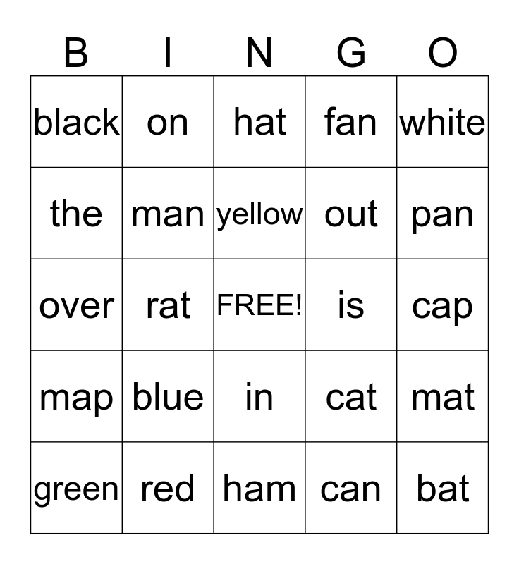 This bingo card has a free space and 24 words: blue, red, yellow, green, white, black, the, on, is, in, out, over, cat, mat, man, can, cap, hat, pan, rat, bat, map, fan and ham.