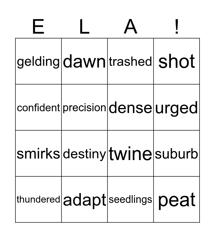 This bingo card has 16 words: adapt, suburb, trashed, gelding, smirks, dawn, twine, seedlings, confident, precision, thundered, shot, destiny, urged, dense and peat.