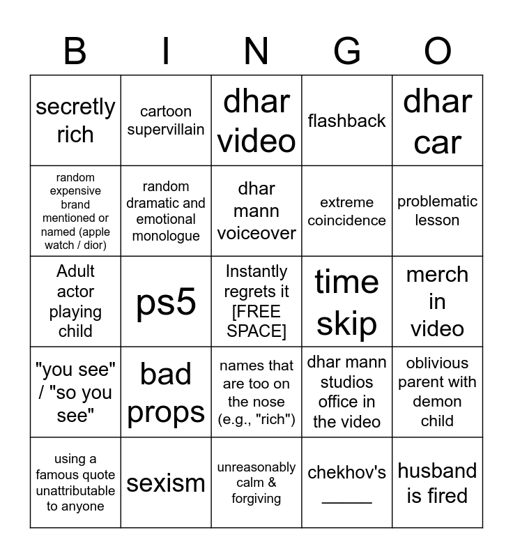 This bingo card has a free space and 39 words: "how would you feel if that happened to you?", child with unrealistic emotional maturity, clearly in the wrong person has an attitude, random dramatic and emotional monologue, using a famous quote unattributable to anyone, names that are too on the nose (e.g., "rich"), dhar mann voiceover, parking lot confrontation, dhar car, "you see" / "so you see", ps5, flashback, husband is fired, merch in video, time skip, bad props, bad green screen, secretly rich, credit card declined, dhar mann studios office in the video, random expensive brand mentioned or named (apple watch / dior), unreasonably calm & forgiving, extreme coincidence, problematic lesson, dhar mann mentioned, what happens in dark will always come to light, fired over something small, random celebrity appearance, inappropriate music, cartoon supervillain, someone gets evicted, kids with ipad, dhar video, sexism, chekhov's _____, Predicting a major plot point, oblivious parent with demon child, Adult actor playing child and Villain has a point..