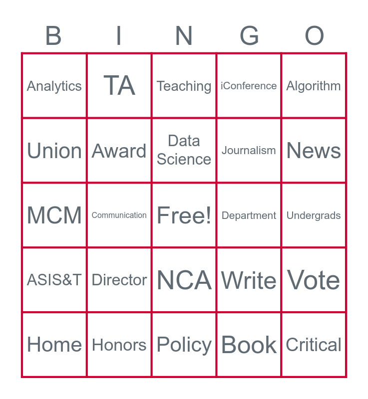 This bingo card has a free space and 29 words: Home, Learning, Communication, Media, Analytics, Teaching, Award, Director, Department, Honors, Undergrads, Critical, Policy, Book, News, ICA, NCA, ASIS&T, Algorithm, MCM, Write, Publish, Journalism, Union, iConference, TA, Vote, Data Science and Professor.