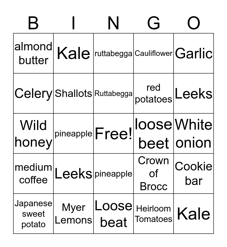 This bingo card has a free space and 24 words: Leeks, Myer Lemons, Ruttabegga, Japanese sweet potato, Garlic, almond butter, Celery, Kale, loose beet, pineapple, red potatoes, Wild honey, Crown of Brocc, Cookie bar, Shallots, Heirloom Tomatoes, White onion, ruttabegga, Leeks, pineapple, Kale, medium coffee, Cauliflower and Loose beat.