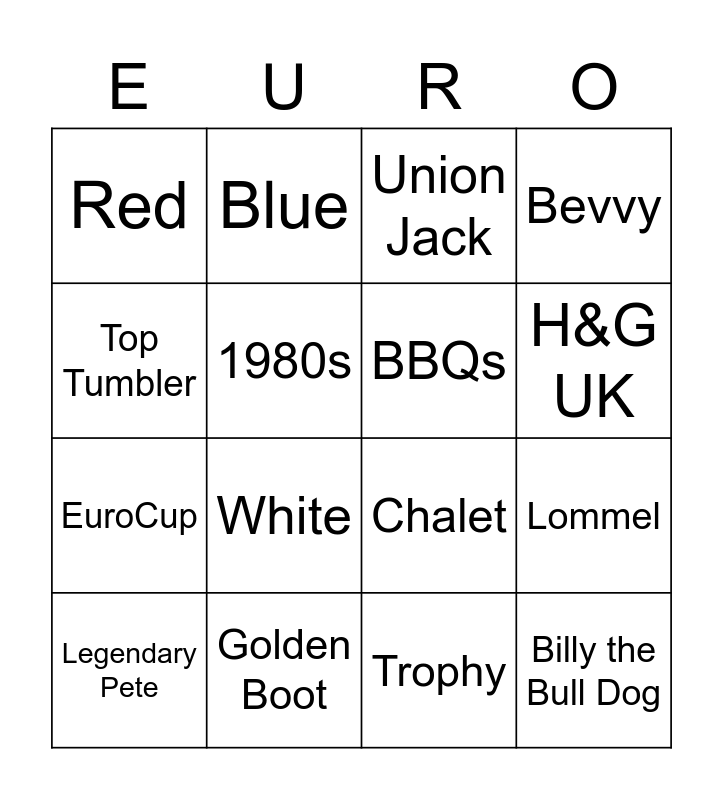 This bingo card has 16 words: Golden Boot, Lommel, Union Jack, Red, EuroCup, Blue, Chalet, Trophy, Top Tumbler, 1980s, Legendary Pete, Bevvy, White, H&G UK, BBQs and Billy the Bull Dog.