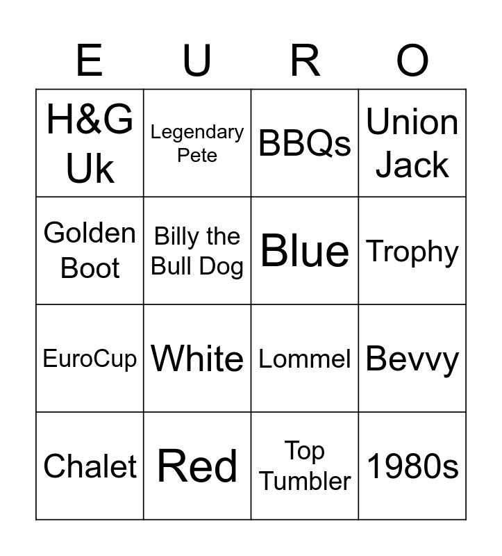 This bingo card has 16 words: Red, Bevvy, BBQs, H&G Uk, EuroCup, Legendary Pete, Lommel, Top Tumbler, Golden Boot, Billy the Bull Dog, Chalet, Union Jack, White, Trophy, Blue and 1980s.