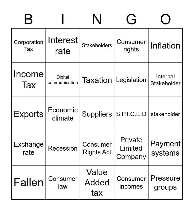 This bingo card has 32 words: Consumer incomes, E-commerce, Economic climate, Social media, Exchange rate, Digital communication, Inflation, Payment systems, Interest rate, Pressure groups, Taxation, Stakeholders, Unemployment, Local community, S.P.I.C.E.D, Consumer spending, Fallen, Exports, Consumer Rights Act, Recession, Private Limited Company, Taxation, stakeholder, Consumer law, Suppliers, Consumer rights, Legislation, Income Tax, Corporation Tax, Value Added tax, Government and Internal Stakeholder.