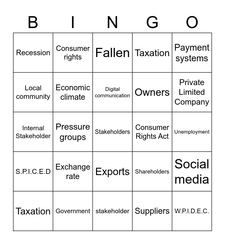 This bingo card has 37 words: Free!, Consumer incomes, E-commerce, Economic climate, Social media, Exchange rate, Digital communication, Inflation, Payment systems, Interest rate, Pressure groups, Taxation, Stakeholders, Unemployment, Local community, S.P.I.C.E.D, Consumer spending, Fallen, Exports, Consumer Rights Act, Recession, Private Limited Company, Taxation, stakeholder, Consumer law, Suppliers, Consumer rights, Legislation, Income Tax, Corporation Tax, Value Added tax, Government, Internal Stakeholder, W.P.I.D.E.C., Shareholders, Owners and Dividend.