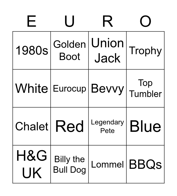 This bingo card has 16 words: Billy the Bull Dog, Blue, Union Jack, 1980s, Chalet, Golden Boot, Legendary Pete, Lommel, White, Eurocup, H&G UK, Trophy, Red, Top Tumbler, Bevvy and BBQs.