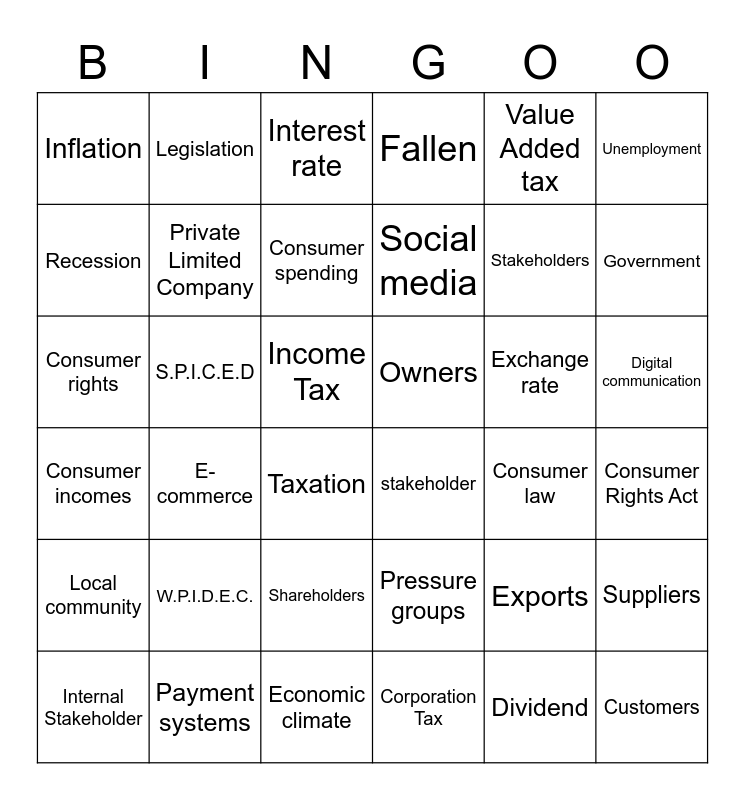 This bingo card has 36 words: Consumer incomes, E-commerce, Economic climate, Social media, Exchange rate, Digital communication, Inflation, Payment systems, Interest rate, Pressure groups, Stakeholders, Unemployment, Local community, S.P.I.C.E.D, Consumer spending, Fallen, Exports, Consumer Rights Act, Recession, Private Limited Company, Taxation, stakeholder, Consumer law, Suppliers, Consumer rights, Legislation, Income Tax, Corporation Tax, Value Added tax, Government, Internal Stakeholder, W.P.I.D.E.C., Shareholders, Owners, Dividend and Customers.