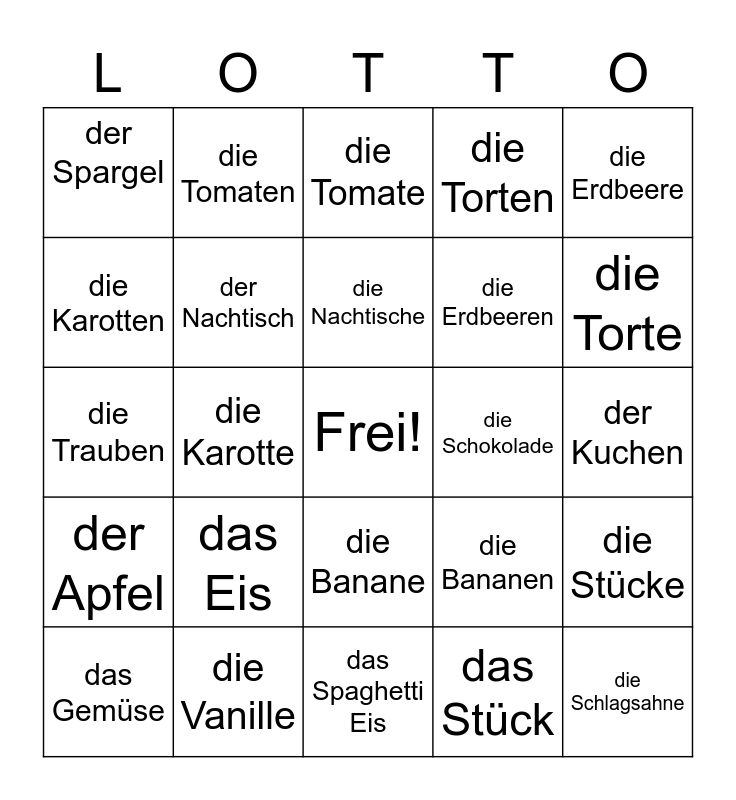 This bingo card has a free space and 29 words: das Gemüse, die Erbsen, die Karotte, die Möhre, der Spargel, die Tomate, der Nachtisch, das Eis, die Schokolade, die Vanille, der Kuchen, die Schlagsahne, das Spaghetti Eis, das Stück, die Torte, das Obst, die Banane, der Apfel, die Erdbeere, die Trauben, die Bananen, die Äpfel, die Erdbeeren, die Karotten, die Torten, die Tomaten, die Stücke, die Nachtische and die Erbse.