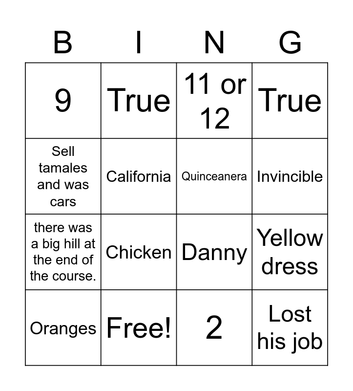 This bingo card has 21 words: Free!, Football, True, Clovis, 2, Quinceanera, 9, 11 or 12, Danny, Invincible, there was a big hill at the end of the course., True, Lost his job, Palo alto, California, 7, Oranges, Chicken, Sell tamales and was cars, Yellow dress and Prison.