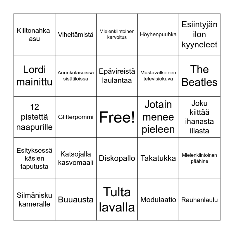 This bingo card has 40 words: "Huomenta Australia", 12 pistettä naapurille, Asunvaihto esityksessä, Aurinkolaseissa sisätiloissa, Buuausta, Diskopallo, Epävireistä laulantaa, Erolaulu, Esiintyjän ilon kyyneleet, Esityksessä käsien taputusta, Glitterpommi, Höyhenpuuhka, Free!, Joku kiittää ihanasta illasta, Jotain menee pieleen, Katsojalla kasvomaali, Keytar, Kiiltonahka-asu, Mersey-joki mainittu, Mielenkiintoinen karvoitus, Mielenkiintoinen päähine, Modulaatio, Mustavalkoinen televisiokuva, Lordi mainittu, Presidentti Volodymyr Zelenskyi, Protestilaulu, Rakkauslaulu, Räppäämistä, Rauhanlaulu, Sade-efekti, Sateenkaari, Silmänisku kameralle, Silvennoinen tunteikkaana, Takatukka, The Beatles, Tulta lavalla, Tuulikone, Verka Serduchka, Viheltämistä and Wardrobe malfunction.