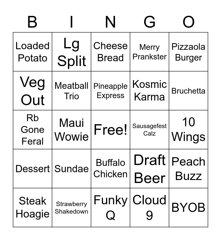This bingo card has a free space and 24 words: Sundae, Strawberry Shakedown, Pineapple Express, Steak Hoagie, Pizzaola Burger, Loaded Potato, Veg Out, Lg Split, Sausagefest Calz, Buffalo Chicken, Kosmic Karma, Rb Gone Feral, Draft Beer, Peach Buzz, Meatball Trio, Cloud 9, 10 Wings, Cheese Bread, Bruchetta, Maui Wowie, BYOB, Dessert, Merry Prankster and Funky Q.