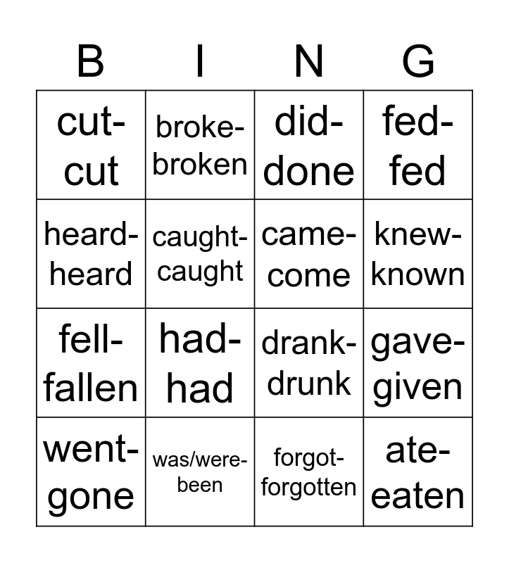 This bingo card has 22 words: was/were-been, began-begun, broke-broken, bought-bought, caught-caught, came-come, cut-cut, did-done, drank-drunk, ate-eaten, fell-fallen, fed-fed, found-found, flew-flewn, forgot-forgotten, got-got, gave-given, went-gone, had-had, heard-heard, knew-known and left-left.