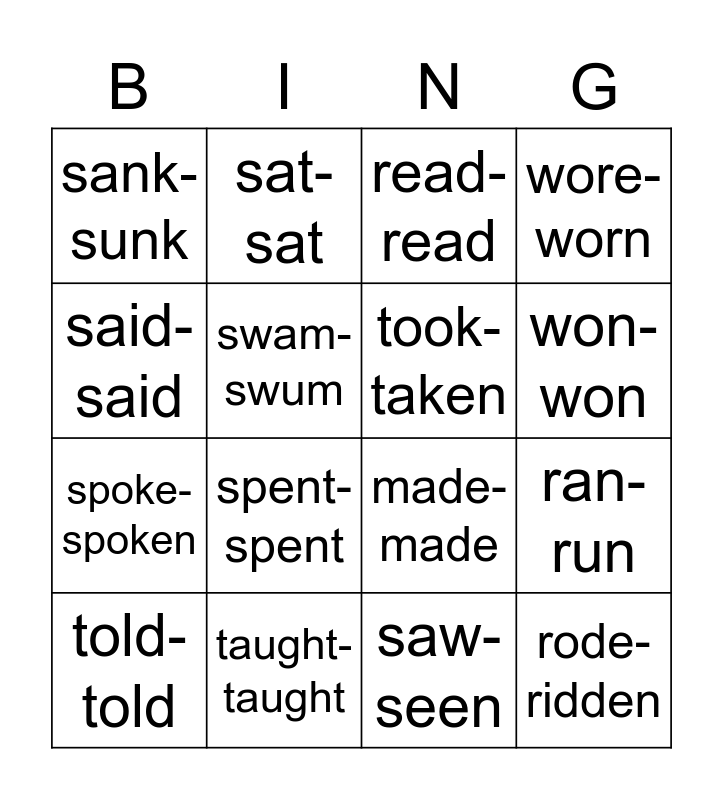 This bingo card has 19 words: made-made, met-met, read-read, rode-ridden, ran-run, said-said, saw-seen, sank-sunk, sat-sat, spoke-spoken, spent-spent, swam-swum, took-taken, taught-taught, told-told, thought-thought, wore-worn, won-won and wrote-written.