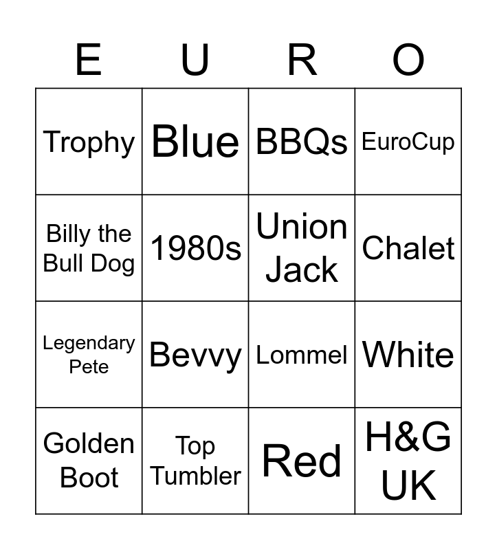 This bingo card has 16 words: Top Tumbler, White, BBQs, Trophy, Legendary Pete, Blue, Lommel, Red, Billy the Bull Dog, 1980s, Golden Boot, EuroCup, Bevvy, Chalet, Union Jack and H&G UK.