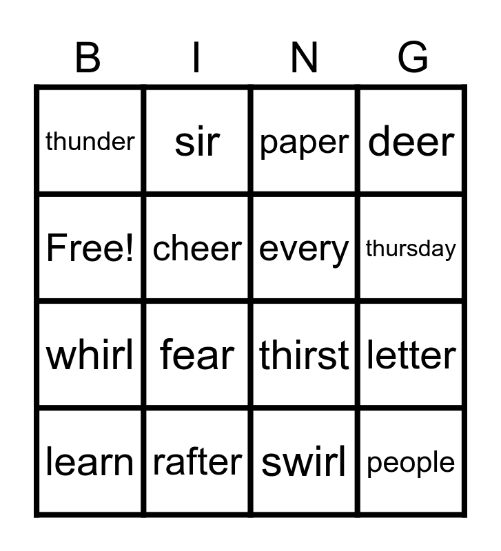 This bingo card has 16 words: rafter, letter, paper, thunder, whirl, sir, thirst, swirl, Free!, cheer, learn, deer, fear, thursday, every and people.