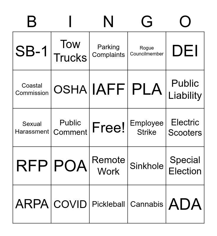 This bingo card has a free space and 27 words: Sinkhole, Homeless, PLA, Pickleball, Coastal Commission, Parking Complaints, Tow Trucks, RFP, Employee Strike, Special Election, Sexual Harassment, Rogue Councilmember, ARPA, COVID, Public Liability, Cyber Attack, OSHA, IAFF, POA, SB-1, Electric Scooters, Cannabis, Public Comment, ADA, Remote Work, DEI and Embezzlement.