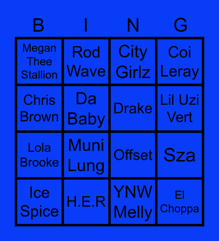 This bingo card has 32 words: Free!, Glorilla, Sza, Lil Wayne, El Choppa, Drake, Chris Brown, Travis Scott, Rod Wave, Lil Baby, Lil Uzi Vert, City Girlz, Future, Summer Walker, H.E.R, Gunna, Migos, Offset, 21 Savage, Cardi B, Beyonce, NBA Young Boy, YNW Melly, Nicki Minaj, Ice Spice, Coi Leray, Lola Brooke, Da Baby, Megan Thee Stallion, King Von, Lil Durk and Muni Lung.
